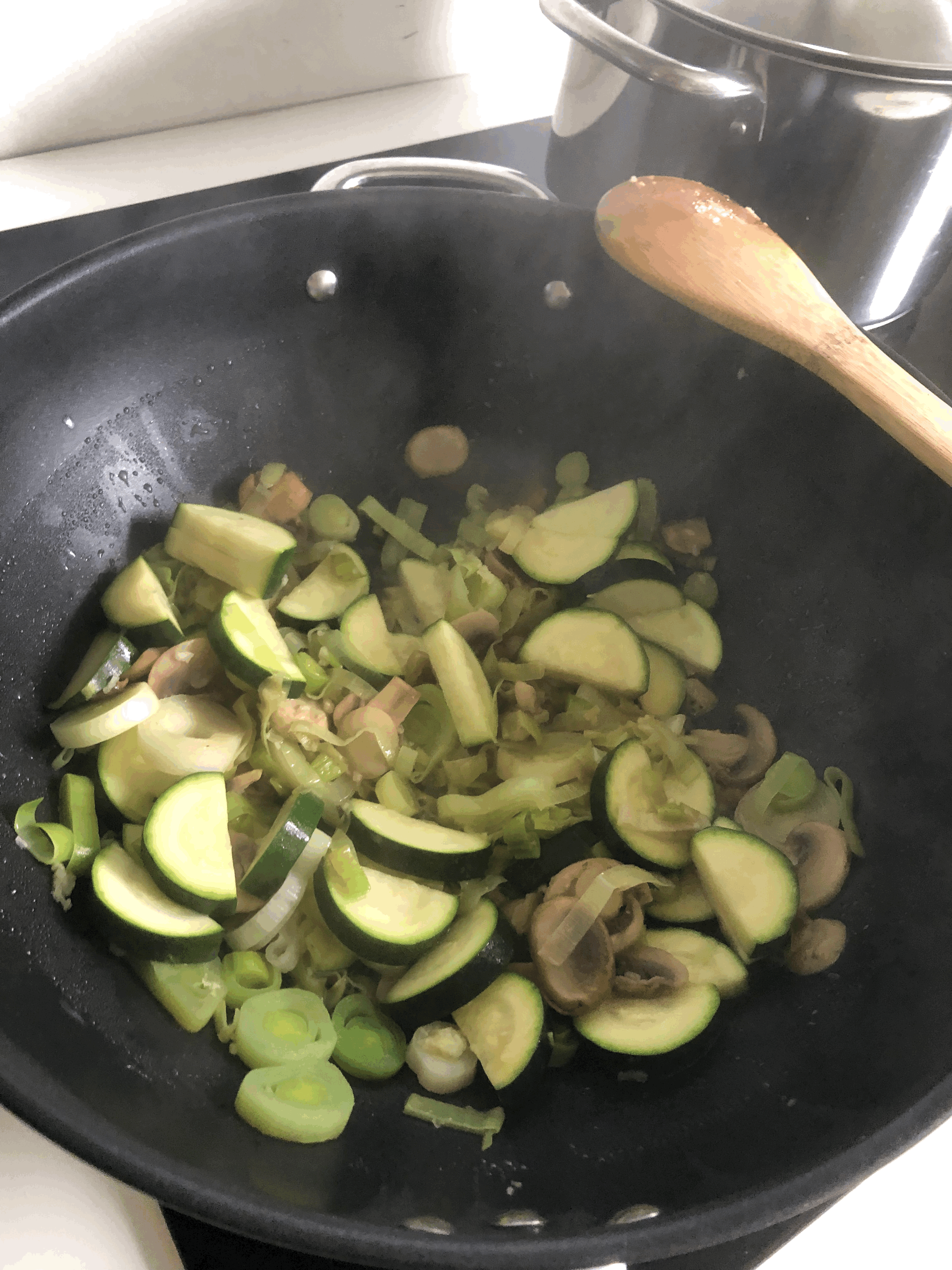 Cukkínit, gombát, póréhagymát ghín párolom, sózom, fokhagymázom, majd rizstejjel és rizsliszttel sűrítem.