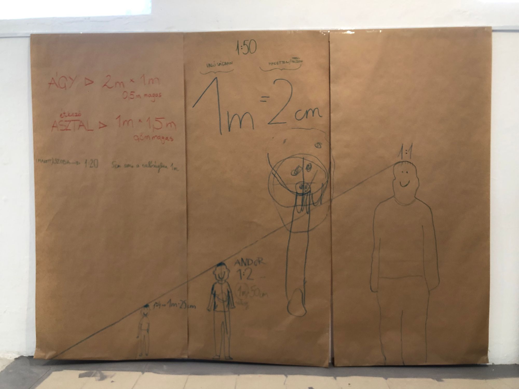 Falra ragasztott papírral, igazi (gyerek) modellel mutattuk meg, hogy lehet egy tárgyat, vagy személyt arányosan csökkenteni. Rajzoltunk 1:1-es, 1:2-es és 1:4-es Andort.