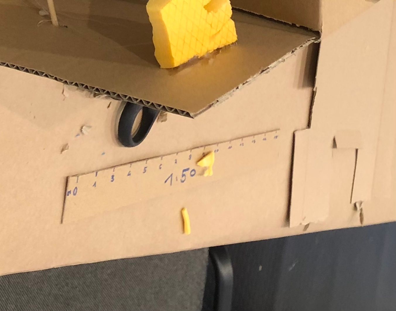 Ezután mindenki elkészítette a saját karton léptékvonalzóját 1:20 (másik oldalán 1:50) léptékkel. Ez a vonalzó segítette őket, hogy a kartondoboz szobájukat 1:20-ban, léptékhelyesen tudják berendezni. További szemléltetéshez kifaragtuk Jocót, hogy még inkább "érezzék" tervezett szobájuk méreteit.
