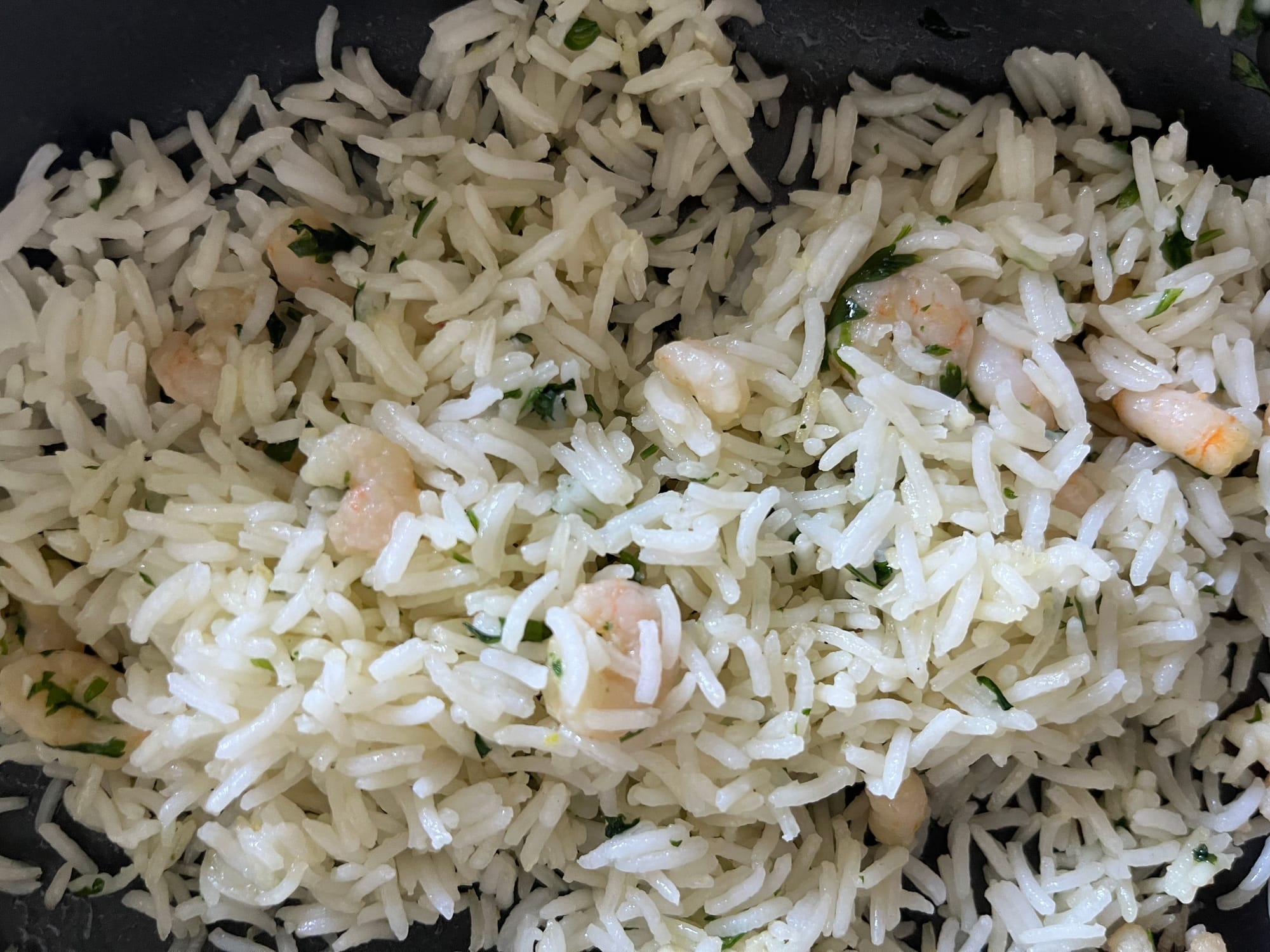 Olívaolajon összesütöd a hozzávalókat (sok petrezselyem, sok fokhagyma, sok garnéla) és a végén összekevered a kifőtt rizzsel!